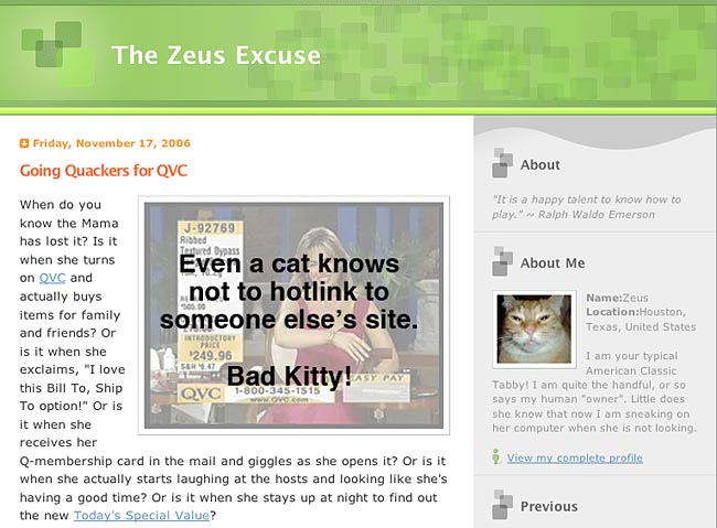 Earlier this week I was going through my referrer logs to see who was linking to my posts and I found another site linking to one of my images. This time it appears the blogger is a cat named Zeus who pens a blog called The Zeus Excuse.