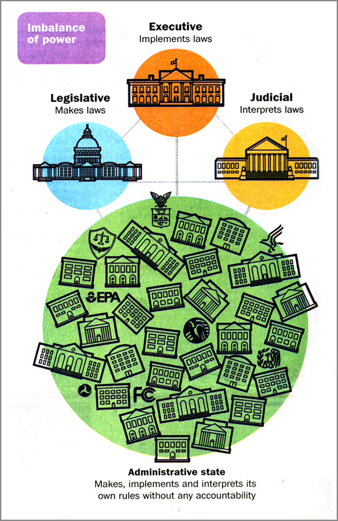 The growing dominance of the federal government over the states has obscured more fundamental changes within the federal government itself: It is not just bigger, it is dangerously off kilter. Our carefully constructed system of checks and balances is being negated by the rise of a fourth branch, an administrative state of sprawling departments and agencies that govern with increasing autonomy and decreasing transparency.